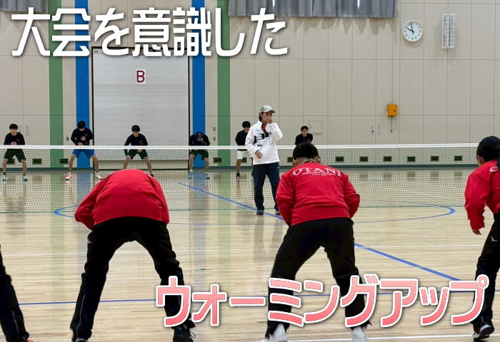 まずは、ウォーミングアップから。インドアの大会は、ウォーミングアップができる時間が少なかったり、試合間が何時間もあいたりします。狭いスペース、短時間でも体があたたまるメニューを厳選してやってもらいました。