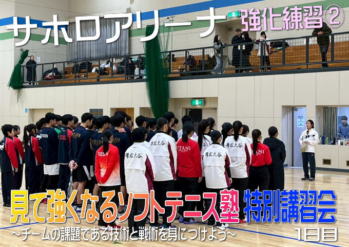 サホロ2日目は「技術講習会」です。今年で3年連続となりますが「見て強くなるソフトテニス塾」の特別講習会を実施しました。今回の講習会のテーマとしては、インドア中に課題としている技術の向上です。今回は内海選手1名を招いての内容となりました。