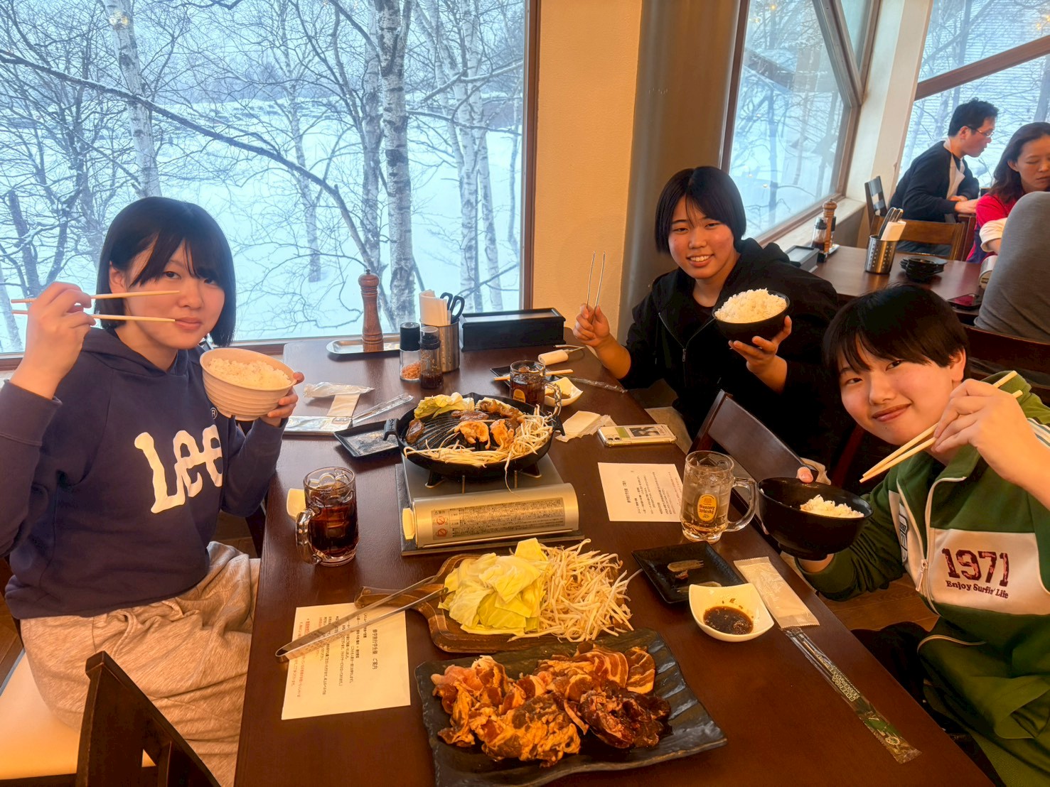 宿泊学習報告(2班) 2班の様子も紹介します!1日目は雪が降り少し視界が悪い中でのスキー講習となりましたが、2日目は驚くほどの快晴。気持ちよくスキーをしているようでした!また、夜にはアイスビレッジやドローンショーをはじめ、花火も打ちあがりました。トマムリゾートを100%楽しむことができたのではないでしょう! ↑クラス別の集合写真です。4月にはクラス替え、1年生最後の学年行事を楽しんでください。 ↑カメラを向けると本当に楽しそうな顔を見せてくれます。 ↑アイスビレッジで楽しむ生徒の様子です。氷と雪の幻想的な世界を楽しんでいました。 ↑ミナミナビーチで遊ぶ男子生徒たち。大はしゃぎです!