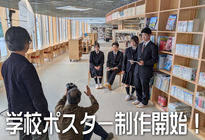 ↑広報用の学校ポスター制作がはじまりました。今年の撮影場所は図書スペースのようです。モデルに選ばれた代表生徒たち。慣れない役割に少し緊張気味ですが、4人とも楽しそうでした。完成が楽しみです!