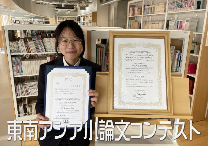 全国から1500件を越える応募があった「第9回高校生東南アジア小論文コンテスト」で1年生の増田咲羅さんが入選を果たし本校生徒では6人目の入選となりました。また、学校奨励賞も3年連続4回目の受賞となりました。