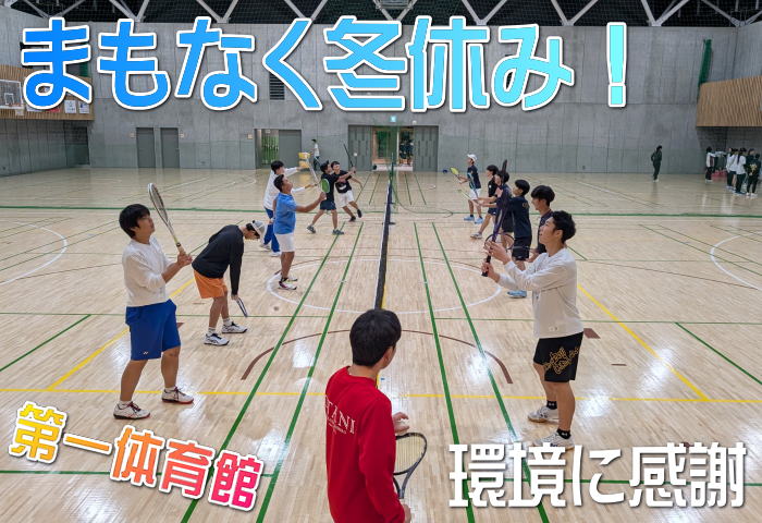 まもなく冬休みです。本校は二つの体育館があり、多くの運動部が譲り合って体育館を使用しています。ソフトテニス部は平日に2回、土日で2回と計4回の割り当てがありますが、新校舎の体育館(第一)は本当にありがたい環境です。早朝7時からの練習でも、夜19時からの練習でも常に温度が一定です。部員たちの健康管理はもちろん、怪我の予防にも繋がっていると思います。感謝の気持ちを忘れず、練習に取り組んでいきましょう!